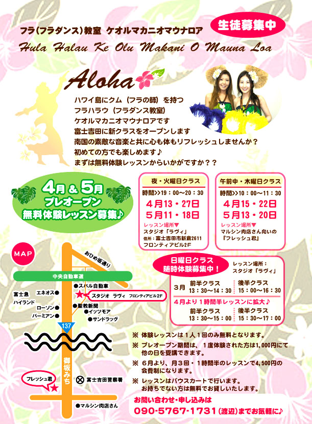 ハワイ島にクム(フラの師)を持つフラ・ハラウ(フラダンス教室)ケオルマカニオマウナロア 山梨